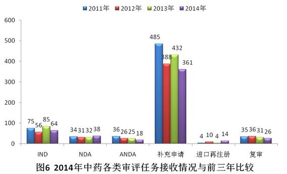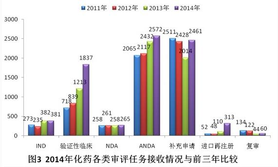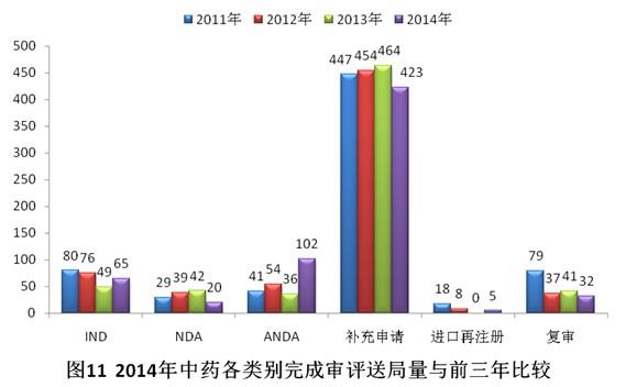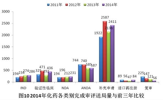 有明确审评结论的注册申请中,建议批准的2960个,建议不批准的842个,总体不批准率为22.1%。与2013年比较,2014年化药除复审外各类别完成审评送局量均有所增加。2014年化药各类别完成审评送局量与前三年比较情况见图10。