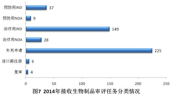 2014年共接收生物制品注册申请458个,其中补充申请占49.1%,治疗用生物制品IND占32.5%。具体见图7。