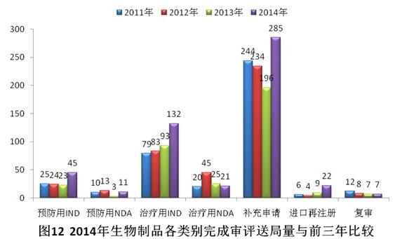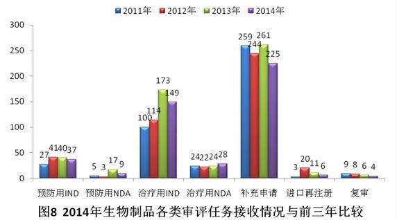 与2013年相比,2014年生物制品除治疗用NDA外,其他各类审评任务接收量均有所下降。具体见图8。