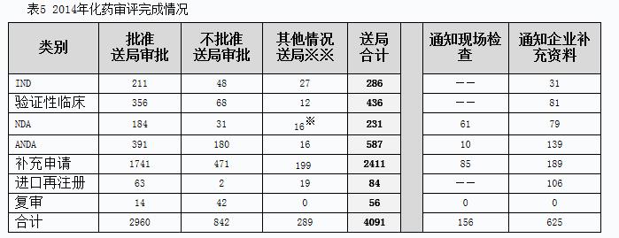 2014年化药完成审评并呈送总局审批的注册申请共4091个,另有完成审评通知现场检查的注册申请156个,完成审评通知企业补充资料的注册申请625个。具体情况见表5。