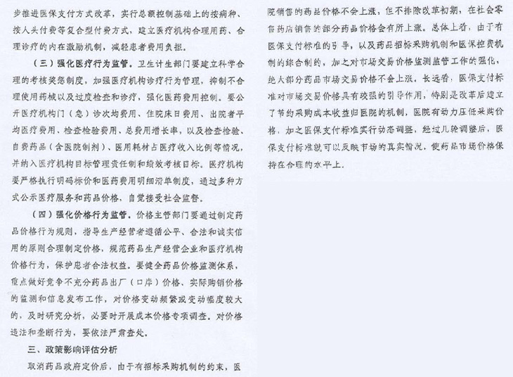 取消药品政府定价后,由于有招标采购机制约束,医院销售药品价格不会上涨。但不排除改革初期,零售药店销售部分药品价格会有所上涨。总体来看,由于有医保支付标准引导,以及招标采购机制和医保控费机制综合制约(价格放开后未来主要价格管理应由卫计委和医保部门负责),加之对市场交易价格监测监管强化(物价部门主要职责是加强市场监管)。绝大部分药品市场交易价格不会上涨。长远看医保支付标准对市场交易价格有较强引导作用。特别是建立节约采购成本收益归医院机制,医院有动力压低药价,加之医保支付标准实时动态调整,经过几轮(压价)调整后,医保支付标准就可以反映市场真实情况。使药品市场价格保持在合理水平上。